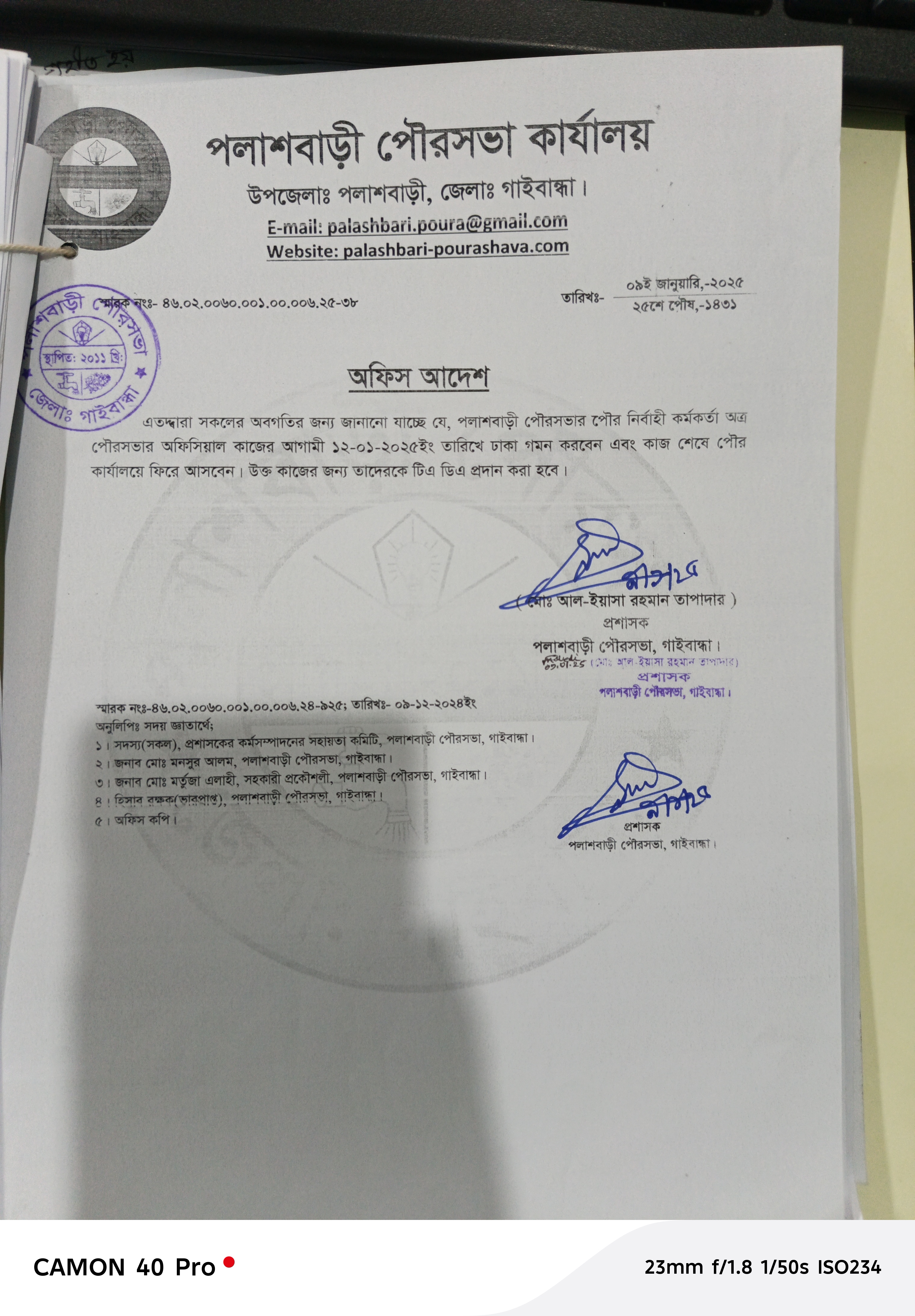 অফিস আদেশ-৩৮ তারিখঃ ০৯/০১/২০২৫ইং