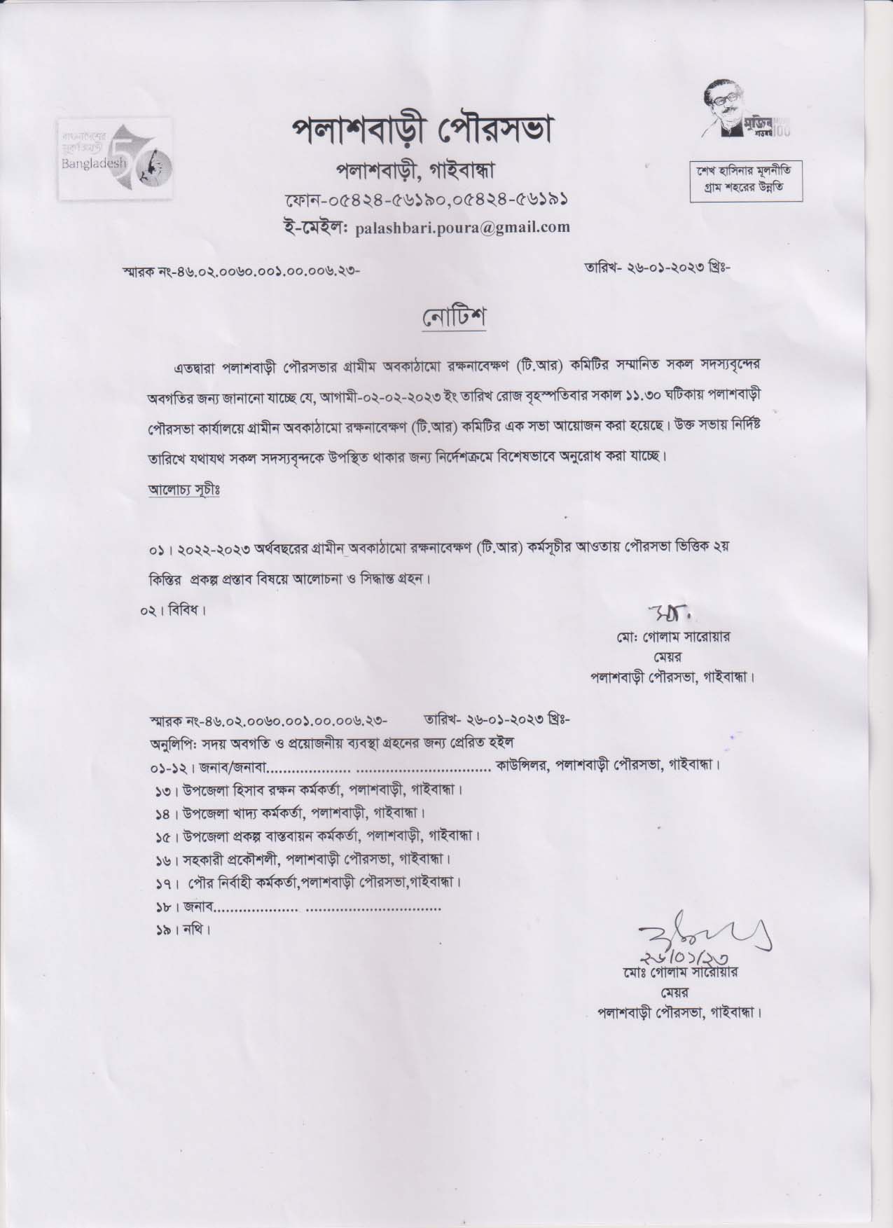 গ্রামীন অবকাঠামো রক্ষণাবেক্ষন (TR) কমিটির সভা আহ্ববান প্রসঙ্গে