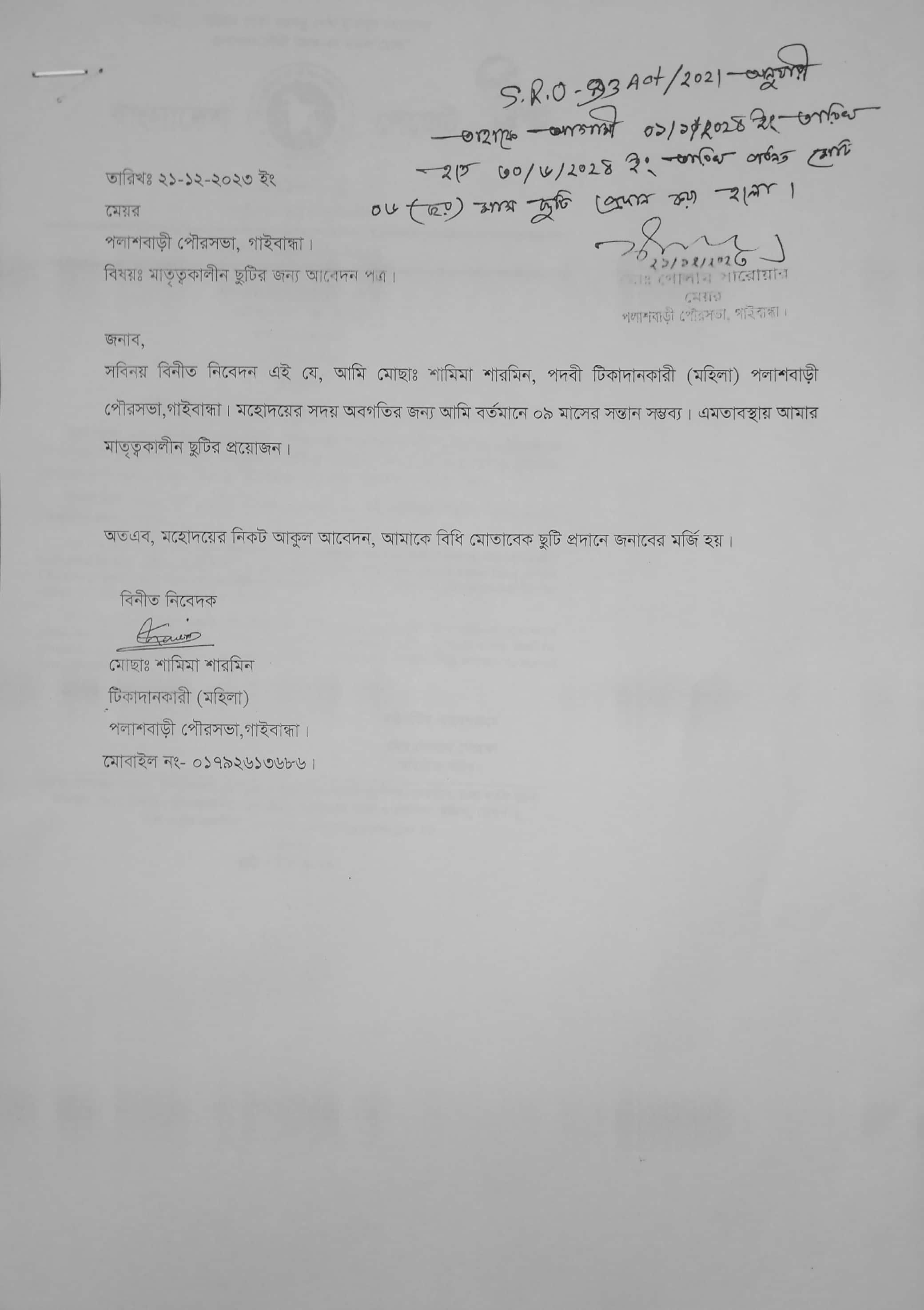 টিকাদান কর্মি মোছাঃ শামিমা শারমিন এর মাতৃত্বকালীন ছুটি সংক্রান্ত