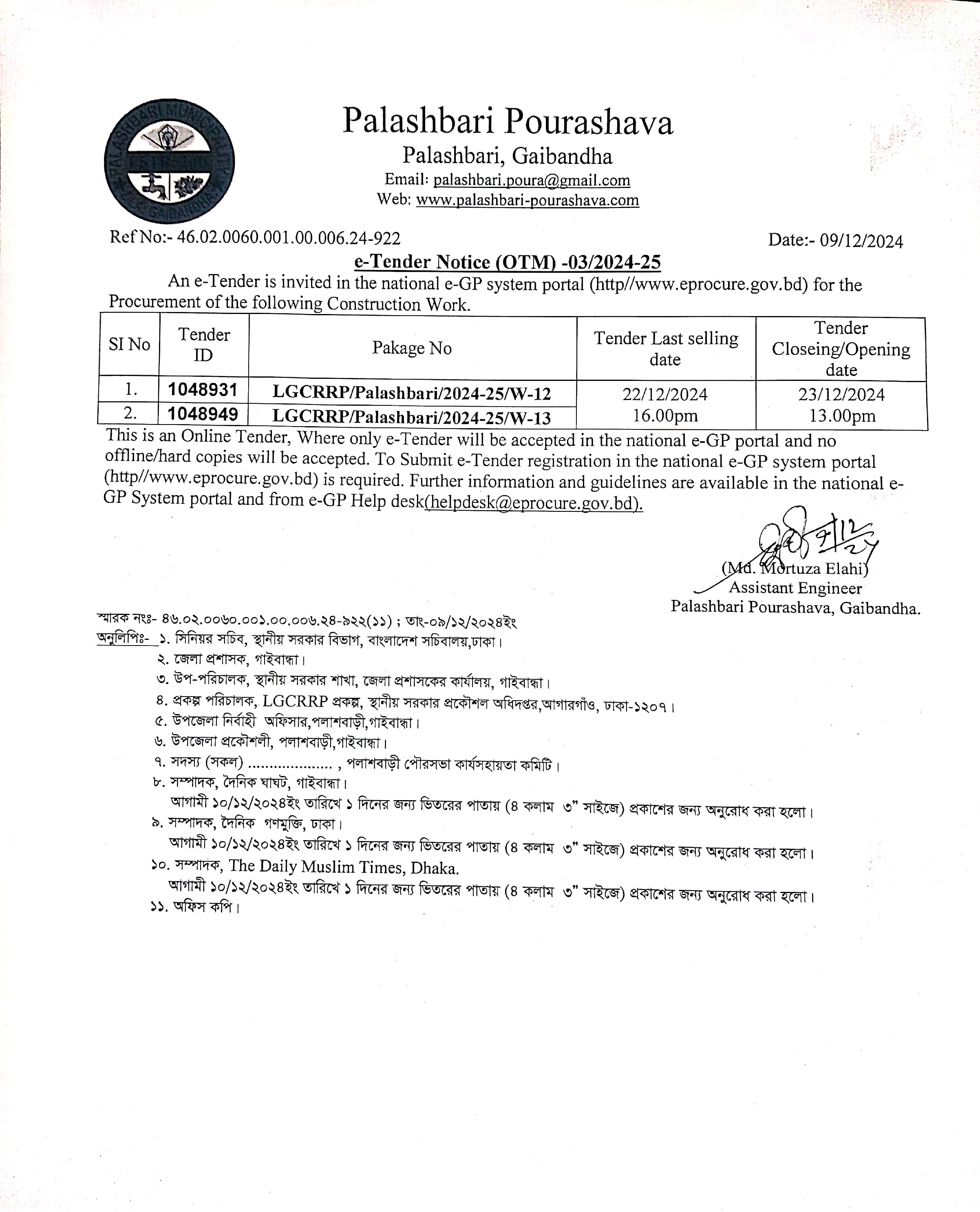 e-Tender-03/2024-25 Notice Ref No: 922 date: 09-12-2024